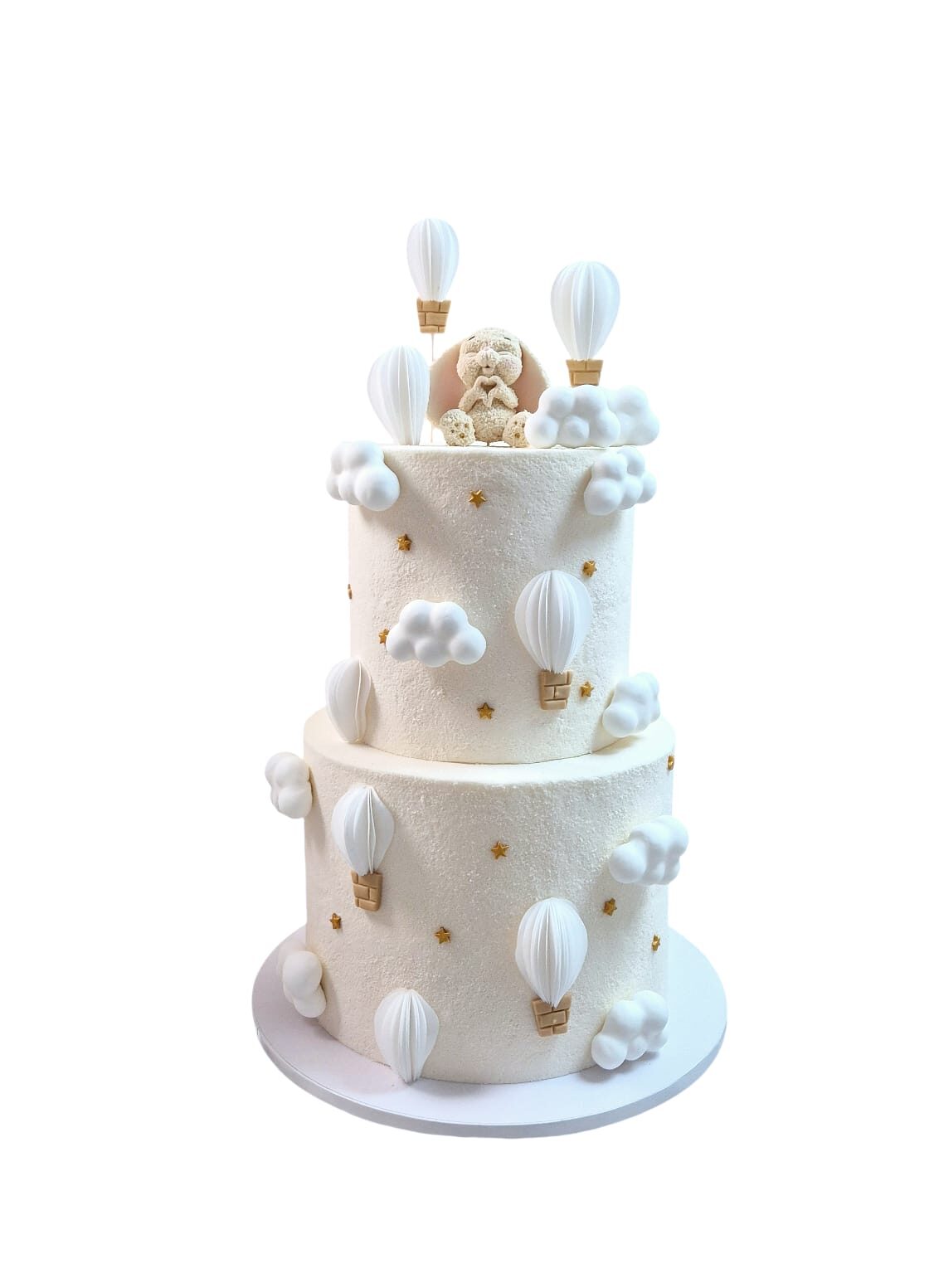 Tort pe două niveluri, decorat cu baloane cu aer cald, nori pufoși și steluțe fine, într-o paletă elegantă de alb și crem. Un design diafan, inspirat din lumea viselor, ideal pentru botez sau prima aniversare.